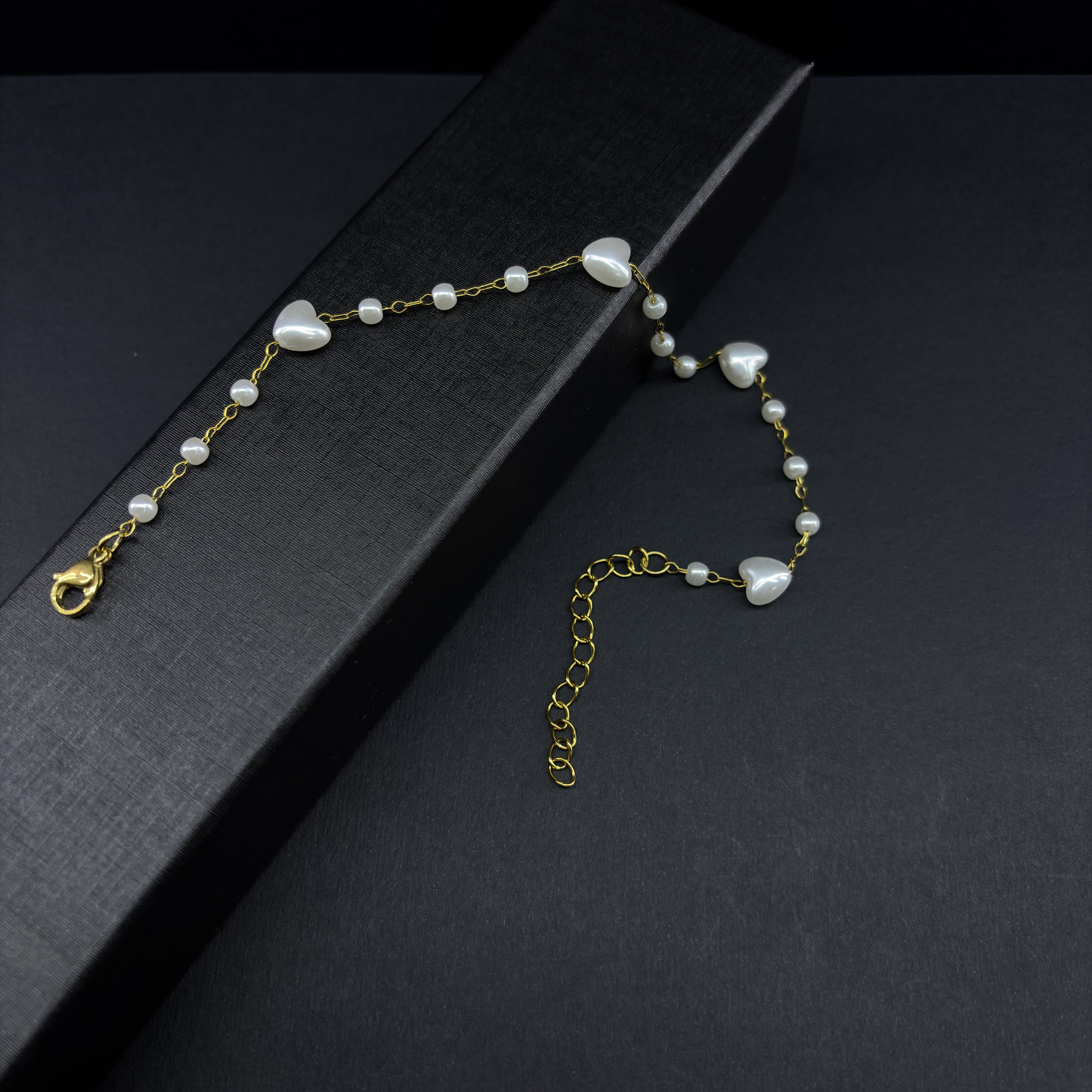 پابند مروارید گرد و قلبی با کیفیت مرواریدهای مرغوب به همراه قفل و زنجیر طلایی استیل که رنگ ثابت بوده و ضد حساسیت میباشد.