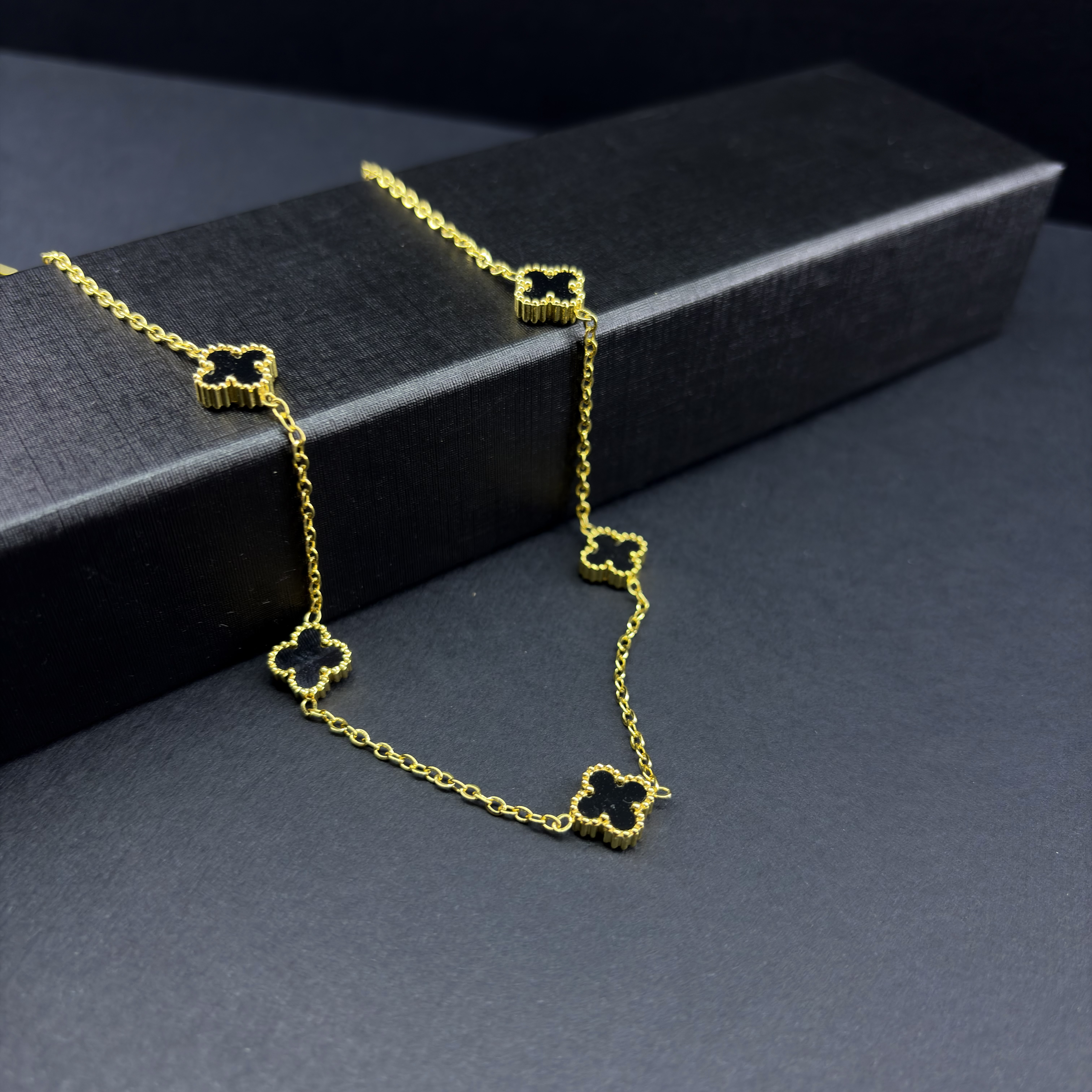 گردنبند ونکلیف طلایی با پنج گل مشکی ریز با صدف های اتمی و قفل و زنجیر تمام استیل از یکی از جدیدترین و بهترین برندهای چینی kasm